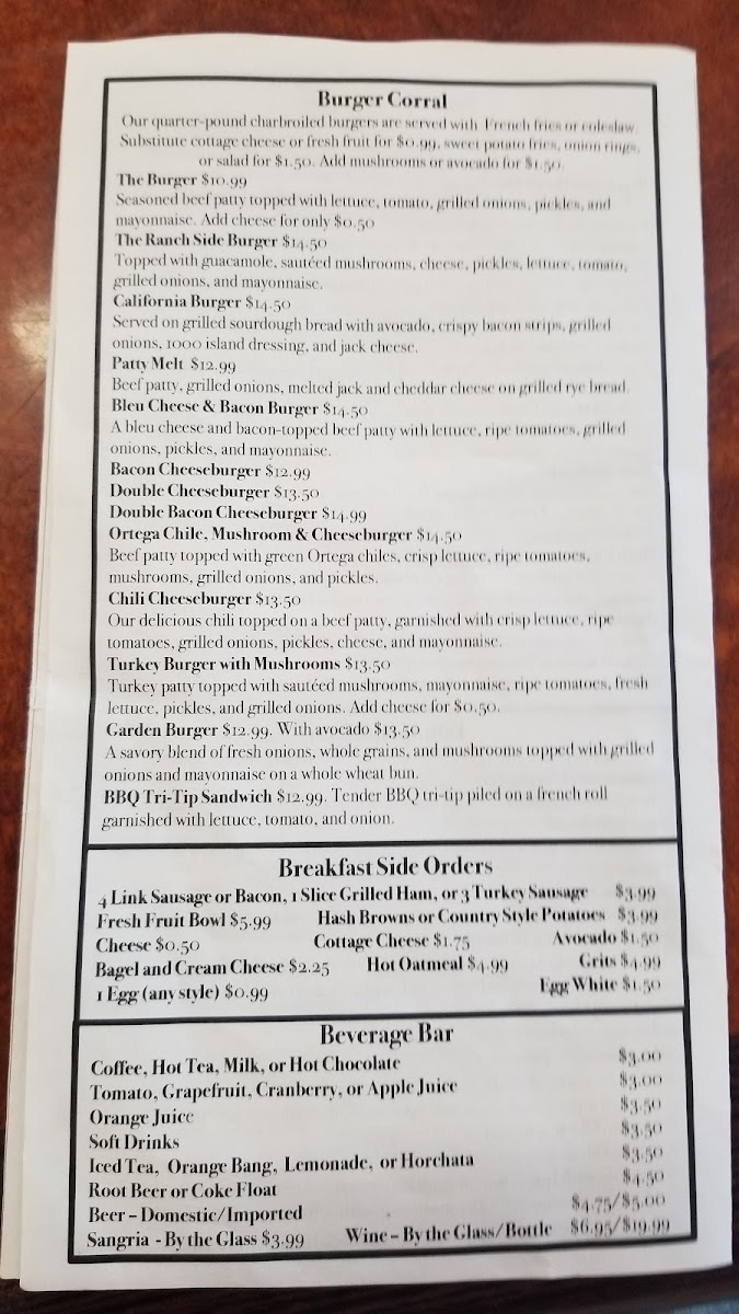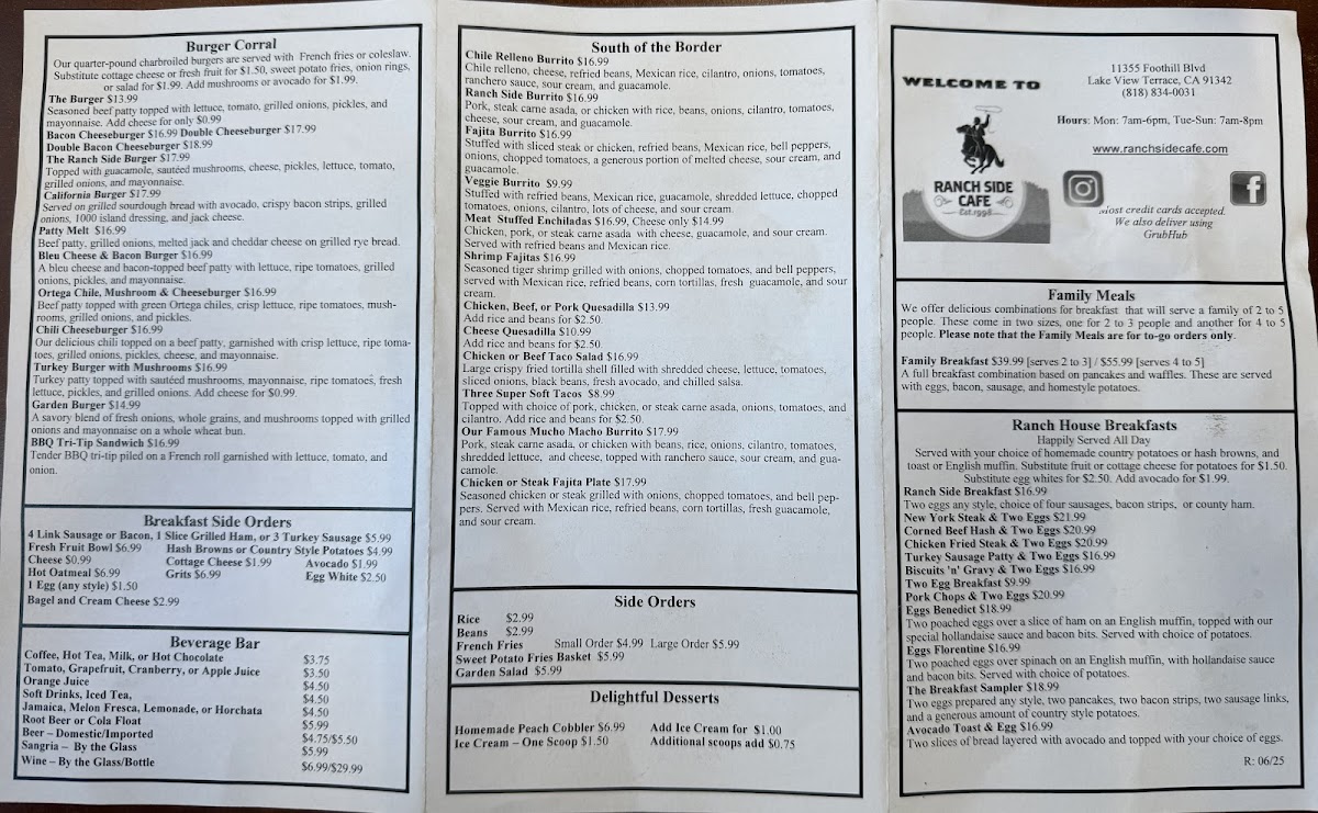 Welcome to Ranch Side Cafe, a delightful spot nestled at 11355 Foothill Blvd in Lake View Terrace, CA. This cozy cafe combines the charm of Hollywood's cowboy era with a vibrant dining atmosphere. Their menu is a treat for food lovers, showcasing generous offerings like the California Omelette, loaded with chopped bacon and fresh avocado, or the hearty Meat Lovers Omelette, perfect for those seeking a protein-packed start to the day.